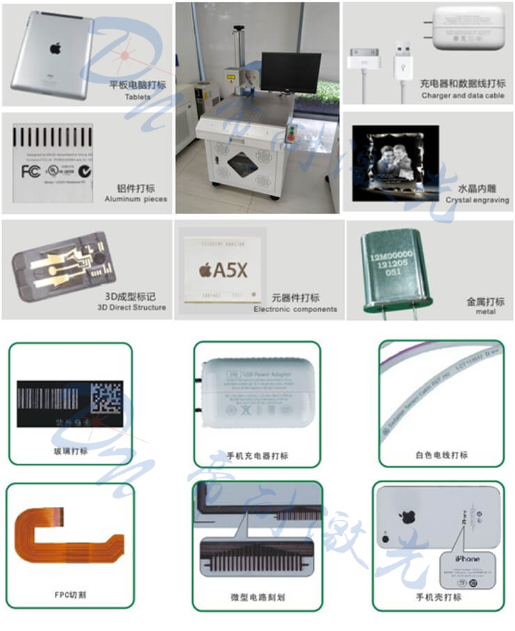 廣泛應用于LCD液晶玻璃,LED基片,藍寶石基片,半導體晶圓,FPC柔性電路板,消費類電子產品,手機部件,陶瓷等的二維碼以及數字字母精細打標,ITO刻膜等行業。